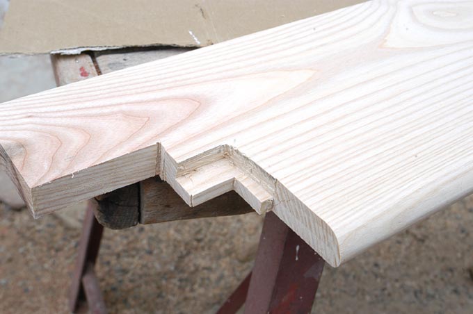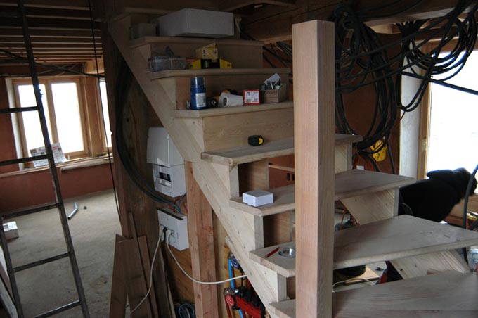 Je fini de mon coté d'entailler les marche pour pouvoir placer les contres marches. Il fait vraiment froid à travailler dehors.