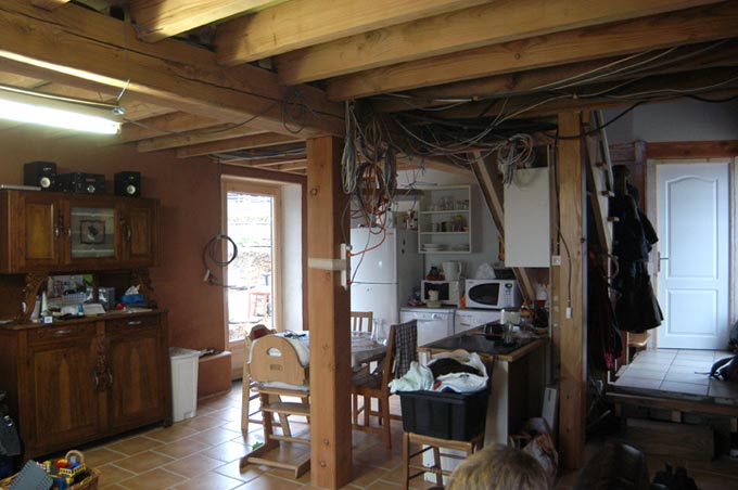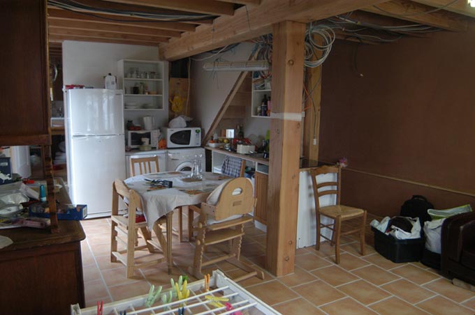 La cuisine. Reste encore quelques câbles (TV, Téléphone et internet) qui pendouillent. A droite, on voit la plateforme. Faut encore que je fasse une marche.
