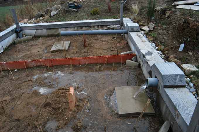 Cela tombe bien, les bassins dépuration qui ont été planté il y a quelques semaines on besoin d'eau. j'en profite aussi tester deux longueurs d'écoulement. Une en milieu l'autre au début des bassins: