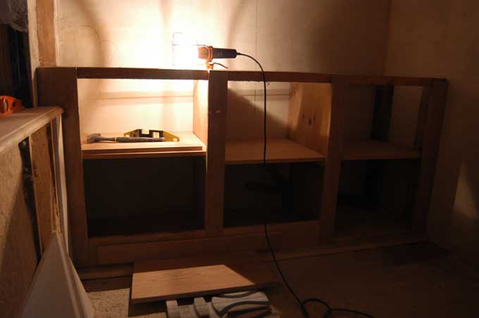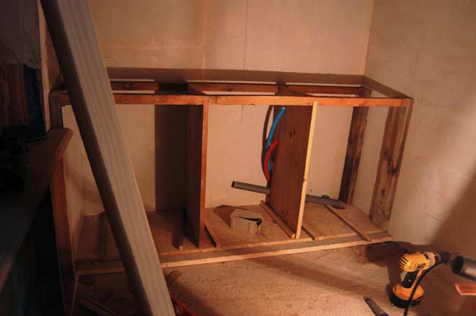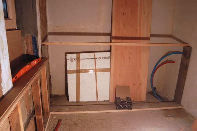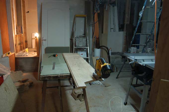 Dans la salle de bain, pose du sol du placard (avec isolation), puis fabrication de la structure du placard, des cloisons intérieures etc...