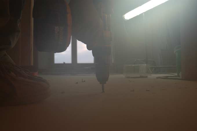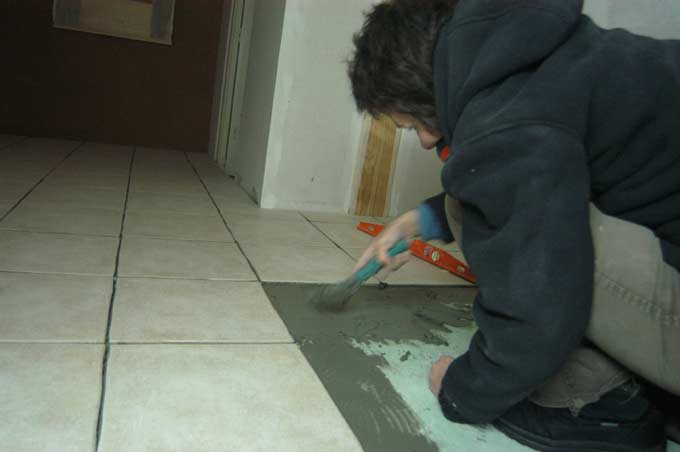 Pose du carrelage dans la chambre parent.