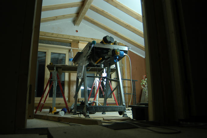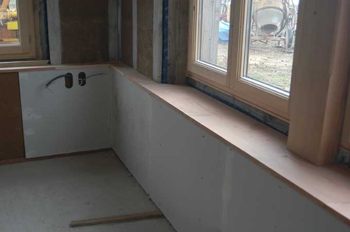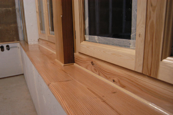Sur les coffres, une tablette de douglas fait presque le tour de la pièce. J'ai pris du douglas à la scierie. On l'a raboté et fait les assemblages chez un menuisier (la machine à bois sera pour la grande maison). Puis on a collé le tout sur place. Ensuite on a fait une moulure à la dégauchisseuse.