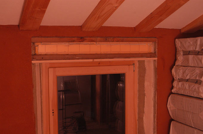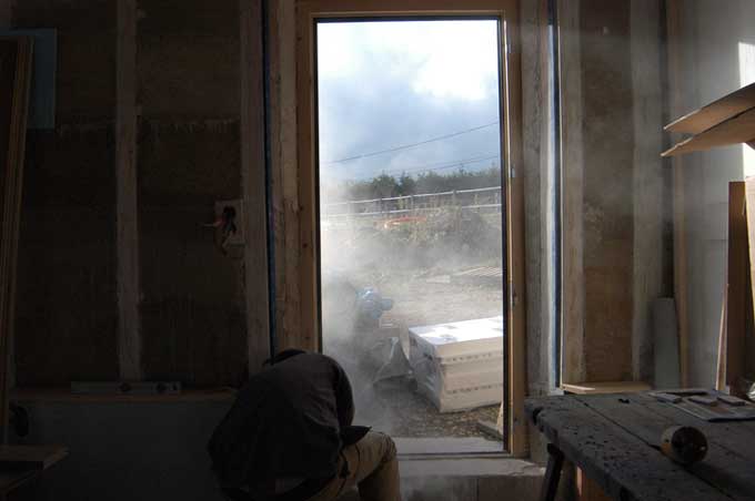 Ensuite peinture (lazure) de toutes les boiseries (fenêtres et tablettes) et protection du tout en prévision du passage de l'enduit terre.
